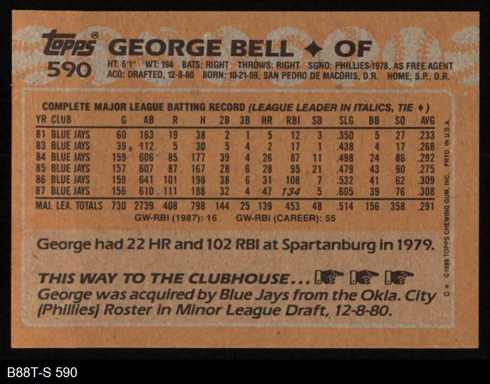 1988 Topps #590 George Bell 8 - NM/MT