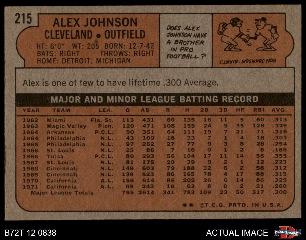 1972 Topps #215 Alex Johnson 4 - VG/EX