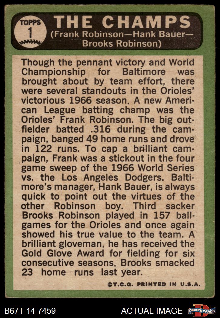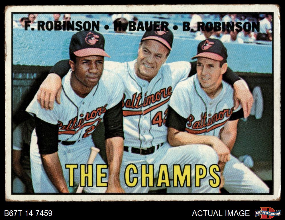 1967 Topps #1 - Frank Robinson / Brooks Robinson / Hank Bauer The Champs 1.5 - FAIR