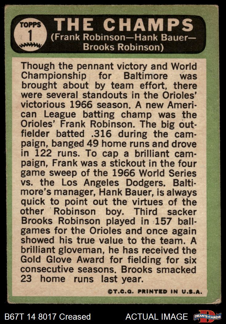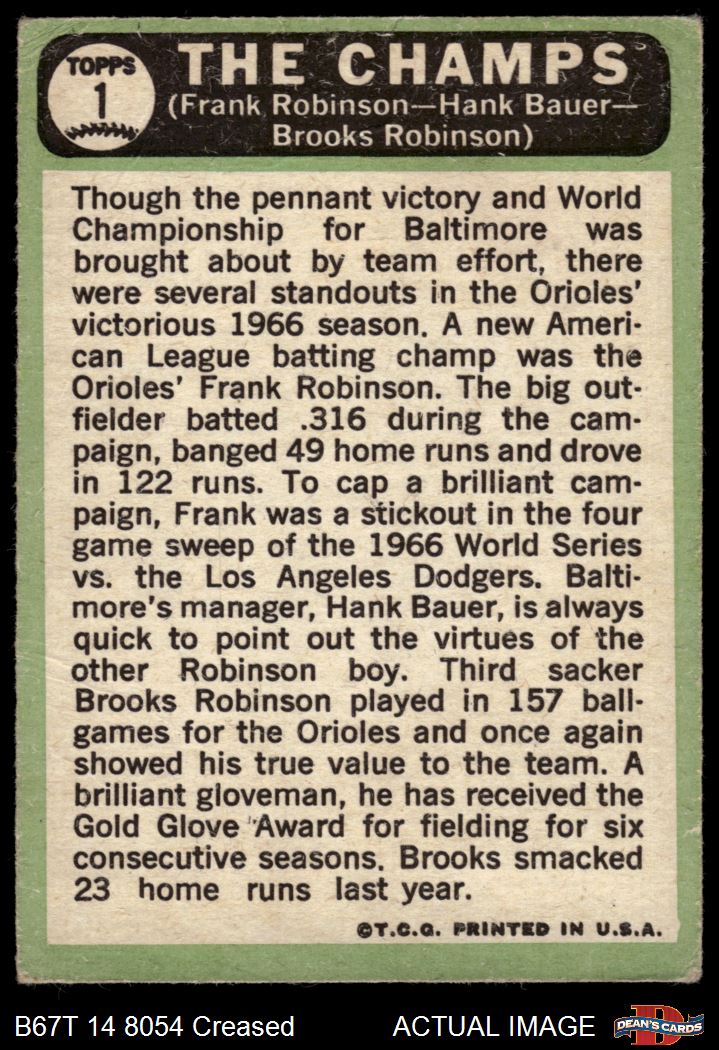 1967 Topps #1 - Frank Robinson / Brooks Robinson / Hank Bauer The Champs 2 - GOOD