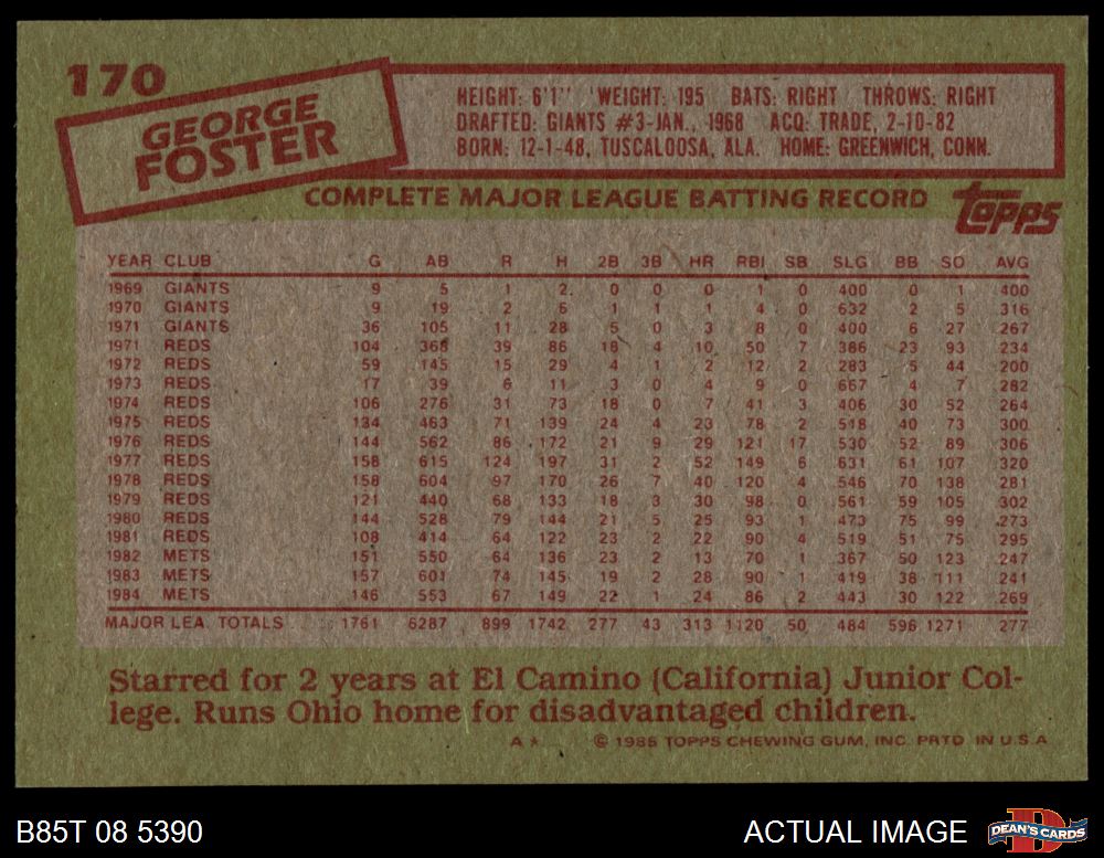 1985 Topps #170 George Foster 8 - NM/MT