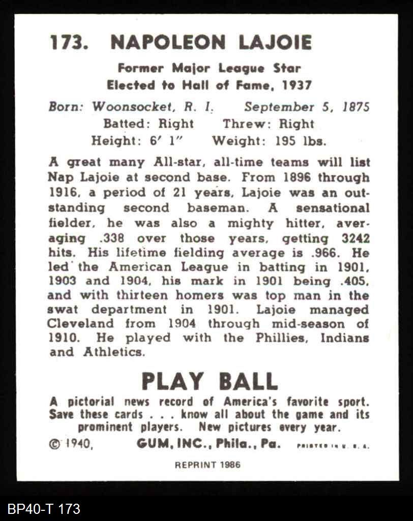 1940 Play Ball Reprint #173 Nap Lajoie 8 - NM/MT