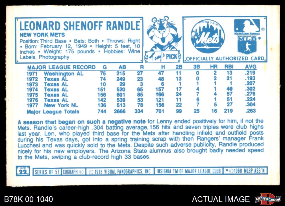 1978 Kellogg's #22 Lenny Randle 5 - EX
