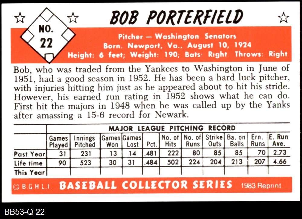 1953 Bowman REPRINT #22 Bob Porterfield 8 - NM/MT