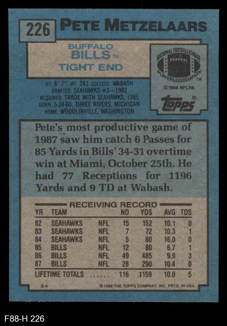 1988 Topps #226 Pete Metzelaars 8 - NM/MT