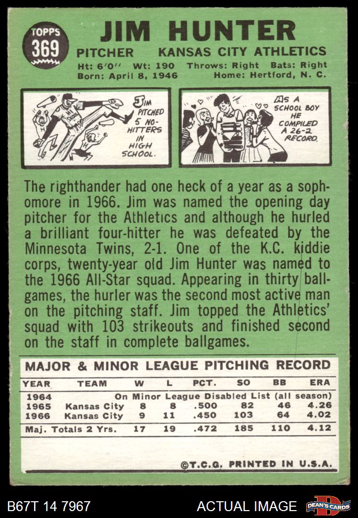 1967 Topps #369 Catfish Hunter 3 - VG