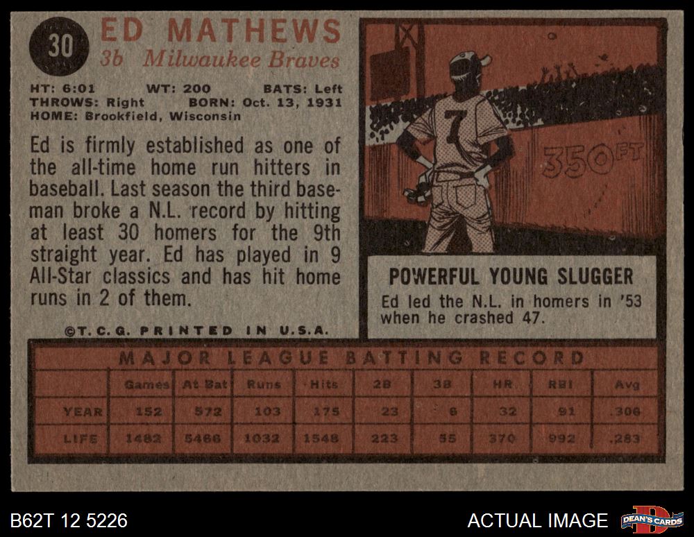 1962 Topps #30 Eddie Mathews 5 - EX