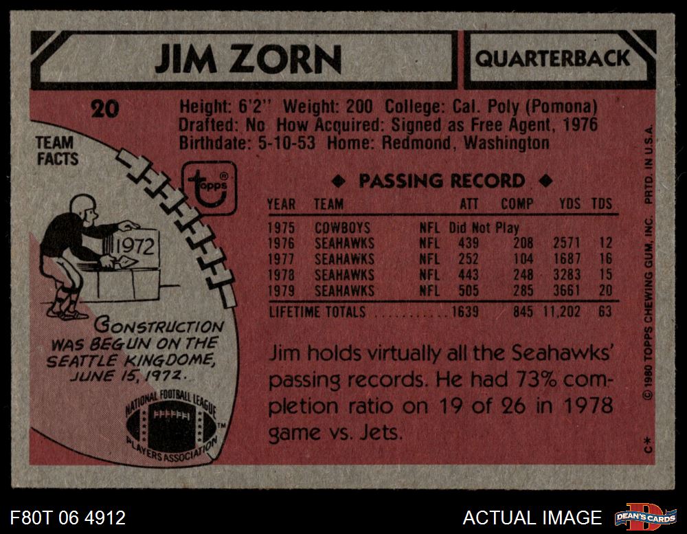 1980 Topps #20 Jim Zorn 5 - EX