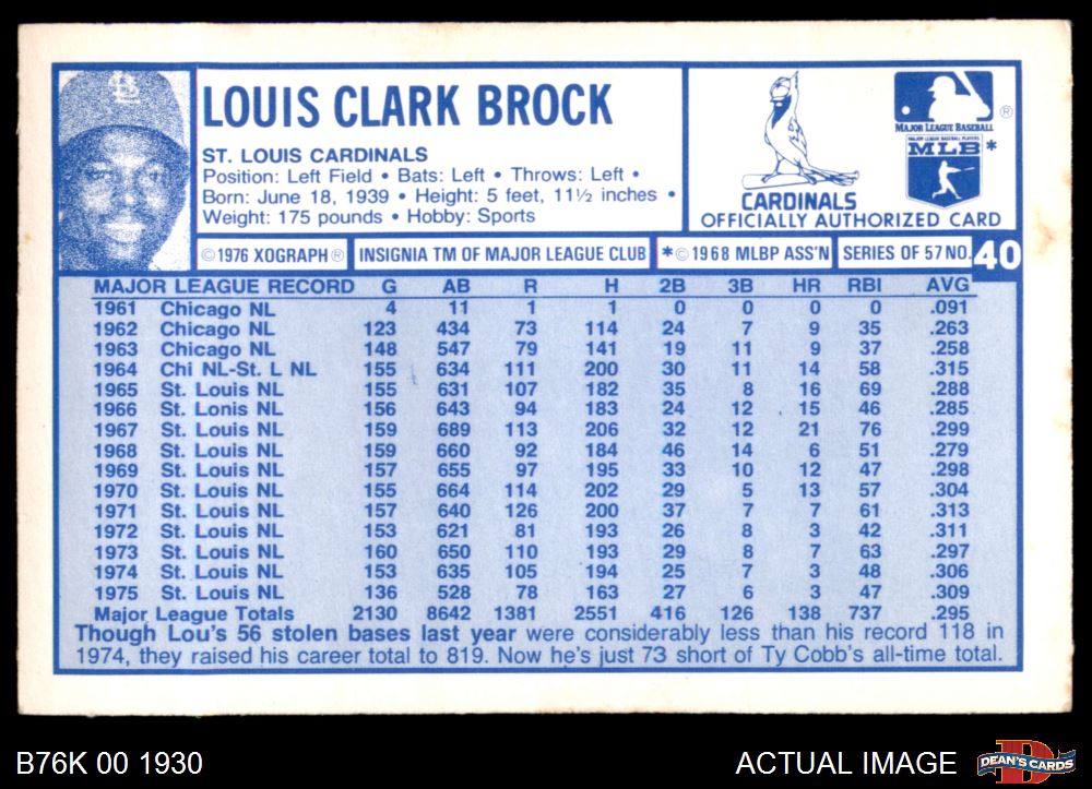 1976 Kellogg's #40 Lou Brock 2 - GOOD