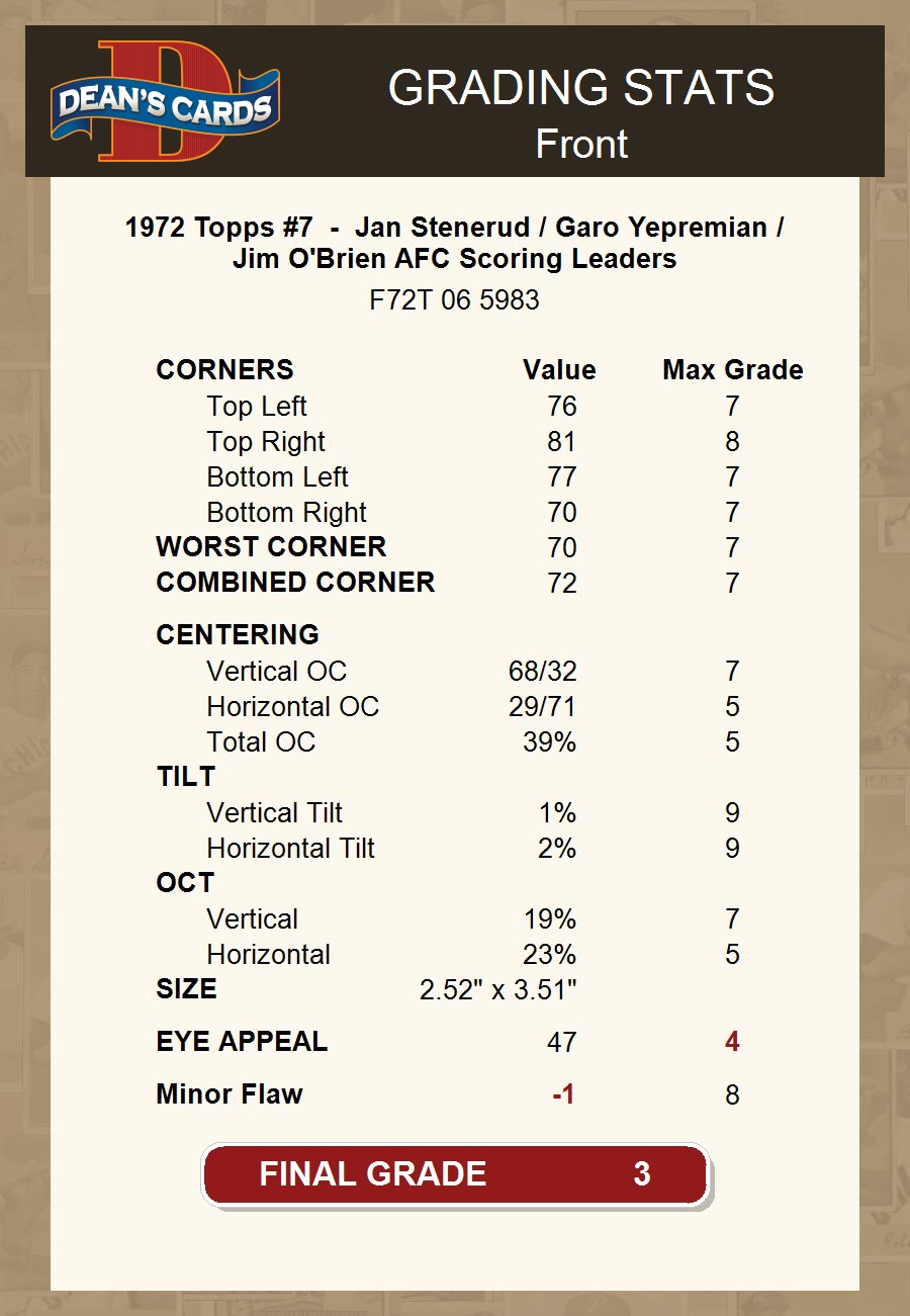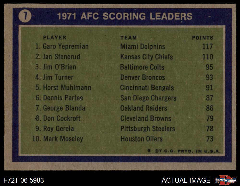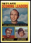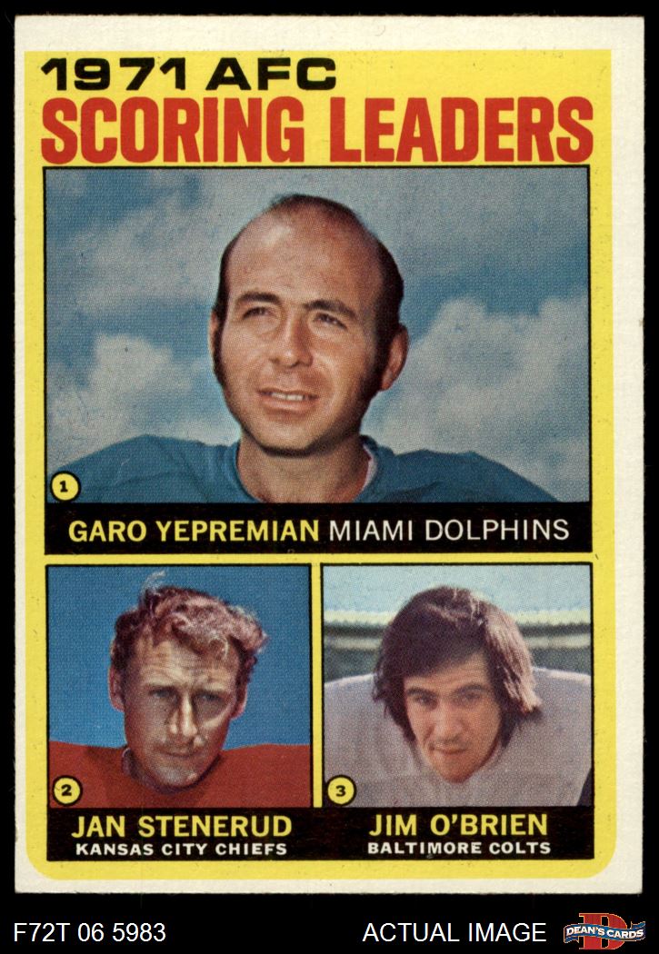 1972 Topps #7 - Jan Stenerud / Garo Yepremian / Jim O'Brien AFC Scoring Leaders 3 - VG