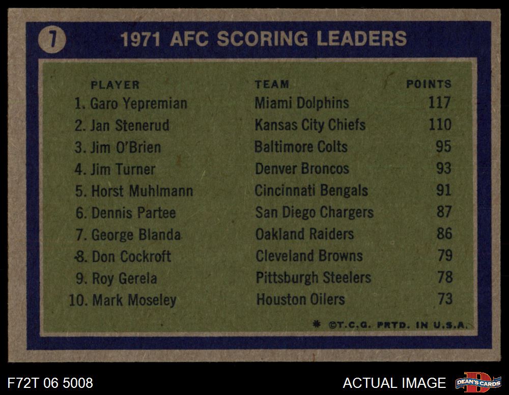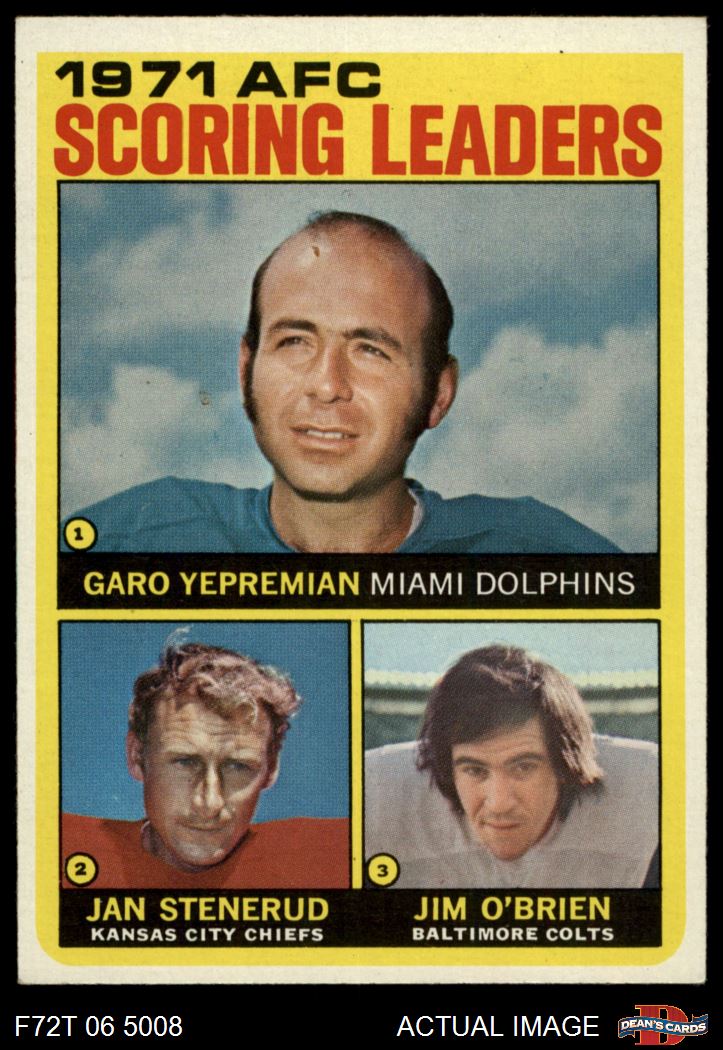 1972 Topps #7 - Jan Stenerud / Garo Yepremian / Jim O'Brien AFC Scoring Leaders 5 - EX