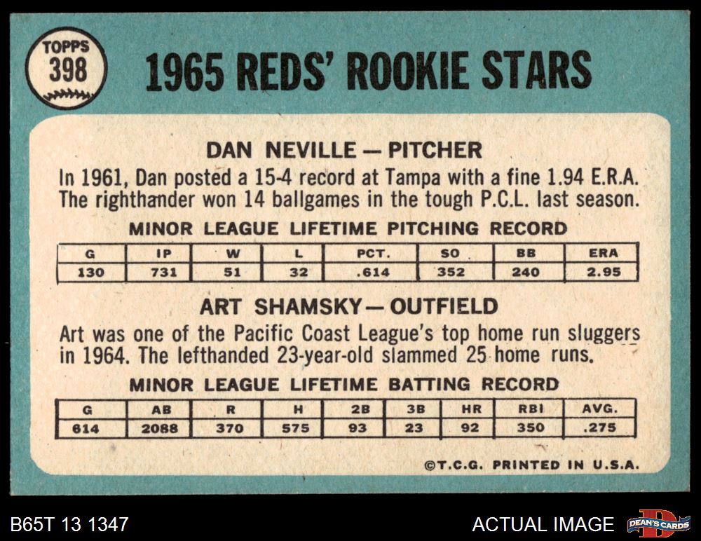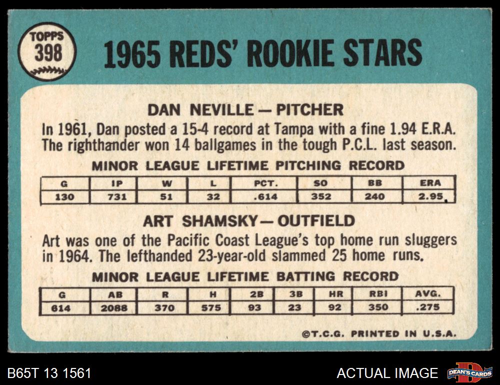 1965 Topps #398 - Art Shamsky / Dan Neville Reds Rookies 5 - EX