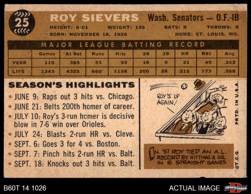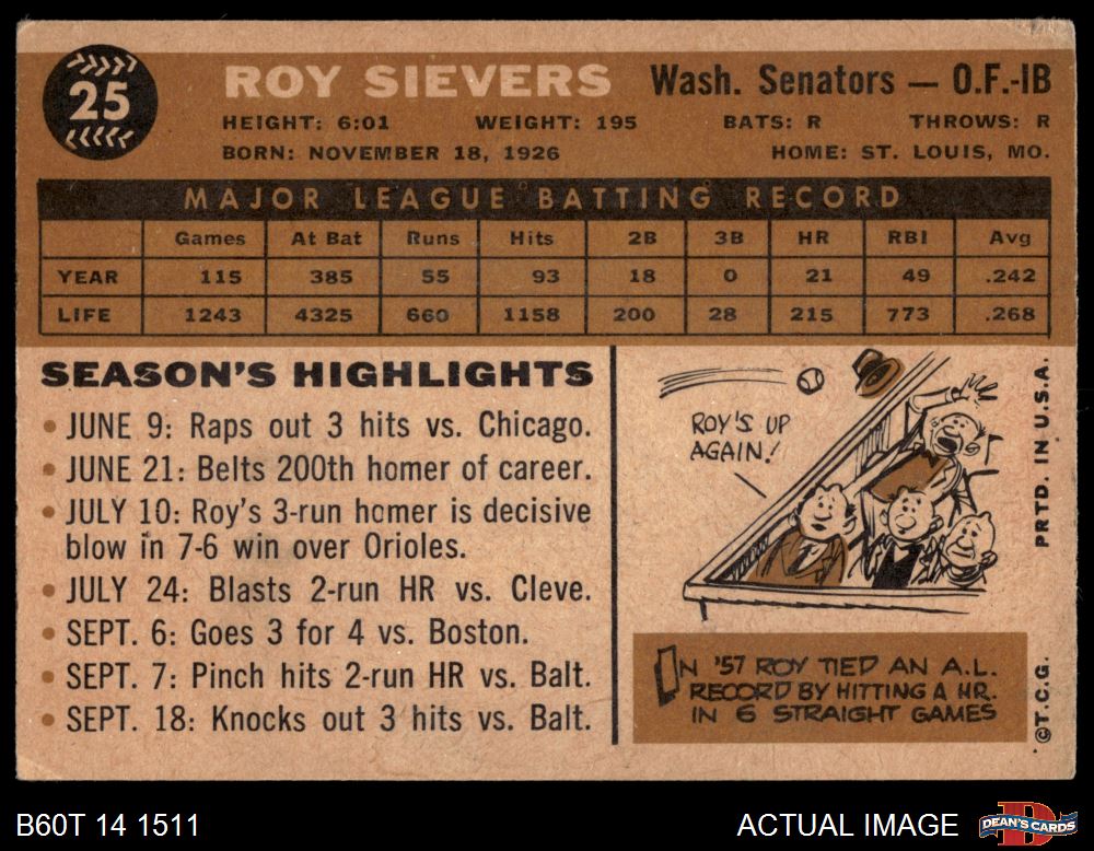 1960 Topps #25 Roy Sievers 3 - VG