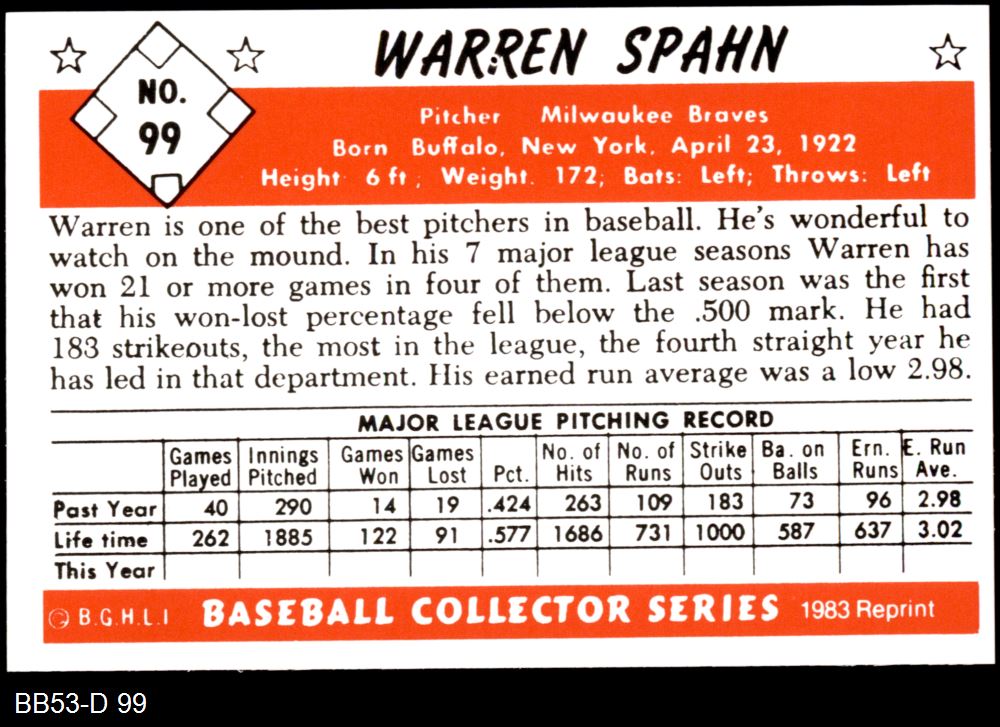 1953 Bowman REPRINT #99 Warren Spahn 8 - NM/MT