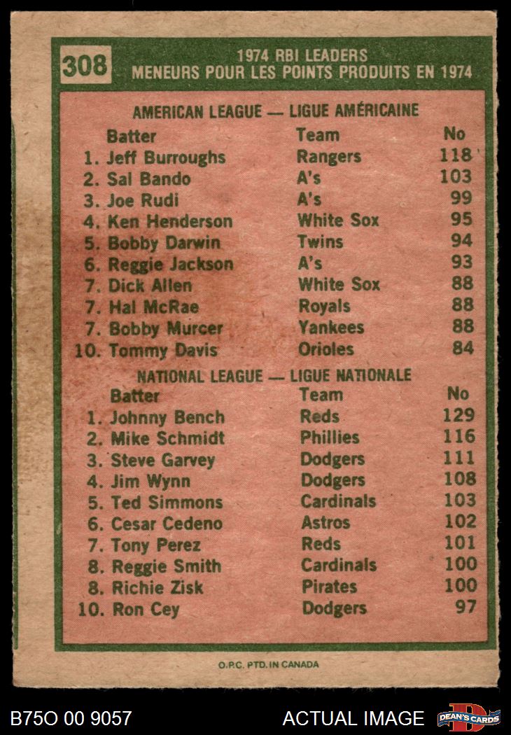 1975 O-Pee-Chee #308 - Johnny Bench / Jeff Burroughs RBI Leaders 3 - VG