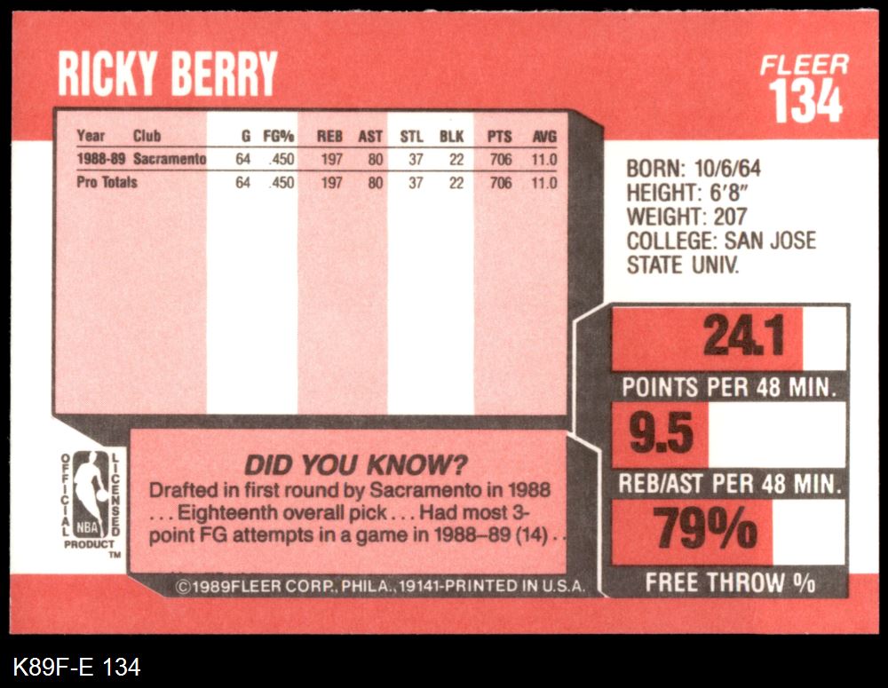 1989 Fleer #134 Ricky Berry 8 - NM/MT