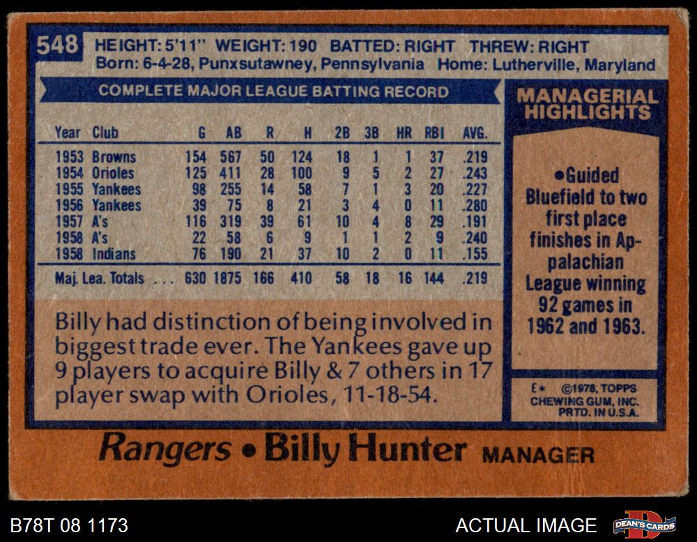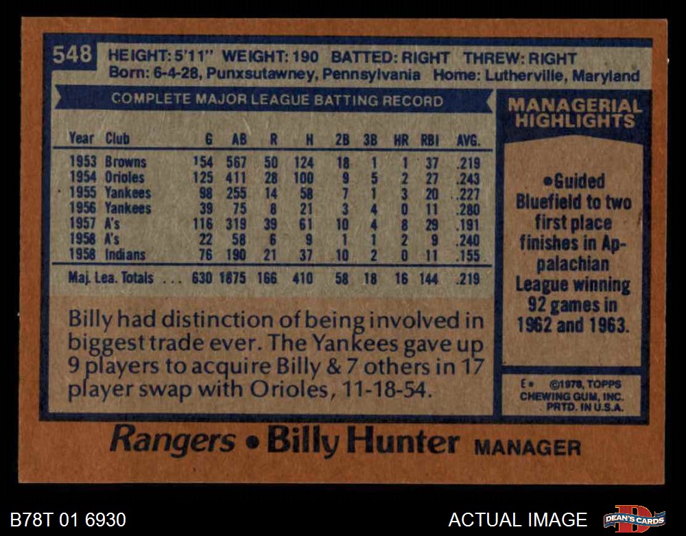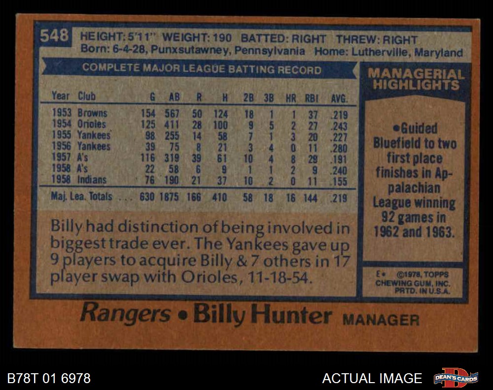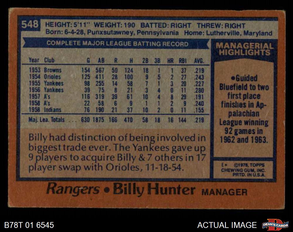 1978 Topps #548 Billy Hunter Front Thumbnail