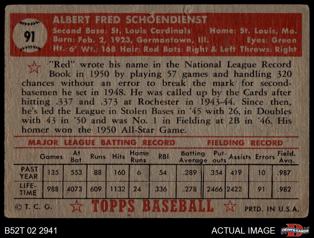 1952 Topps #91 Red Schoendienst 1 - POOR