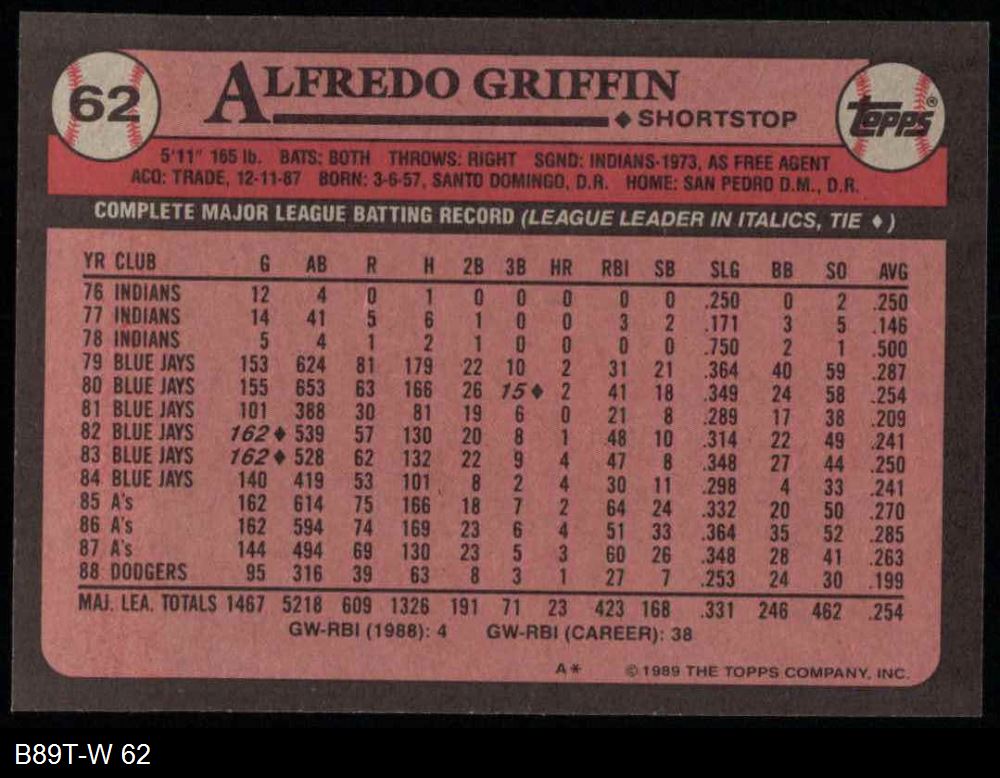 1989 Topps #62 Alfredo Griffin 8 - NM/MT