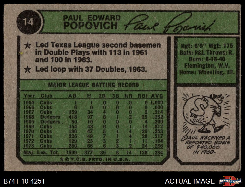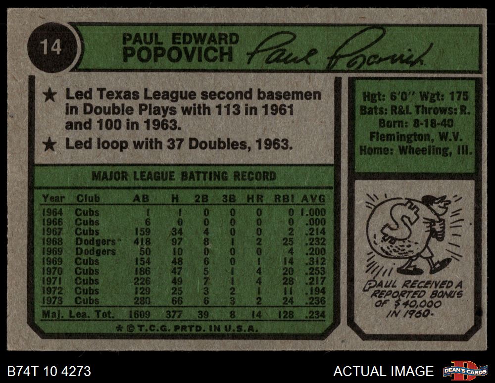 1974 Topps #14 Paul Popovich 4 - VG/EX