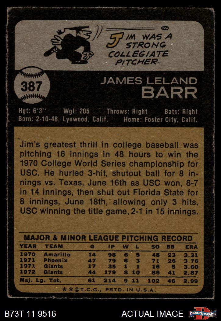 1973 Topps #387 Jim Barr 3 - VG
