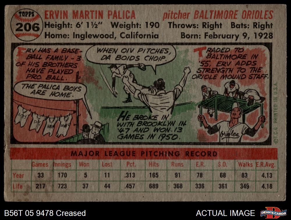 1956 Topps #206 Erv Palica 2 - GOOD
