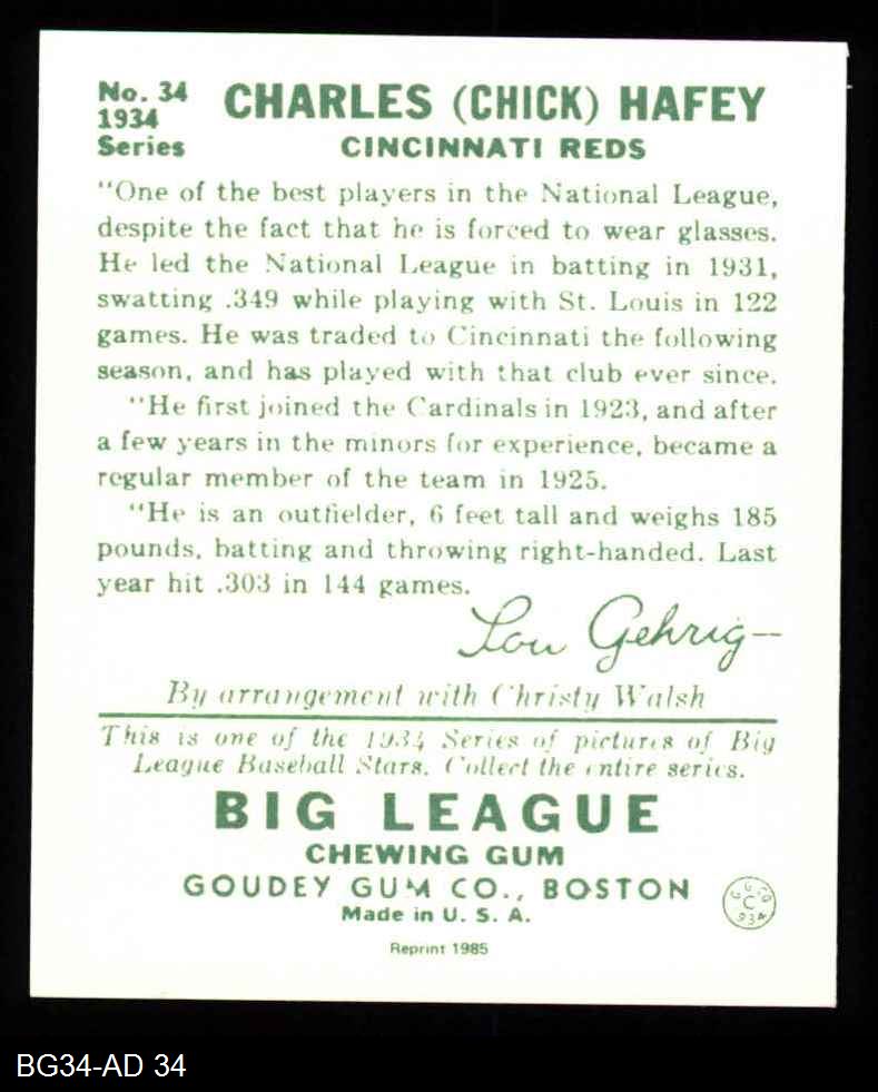 1934 Goudey Reprint #34 Chick Hafey