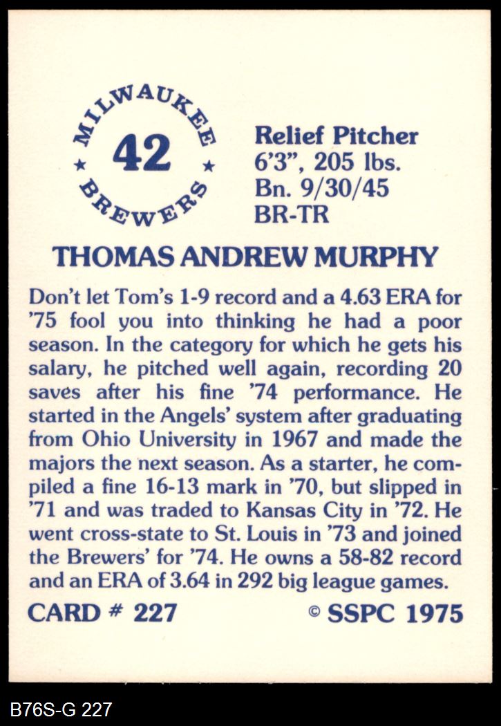 1975 SSPC #227 Tom Murphy 8 - NM/MT