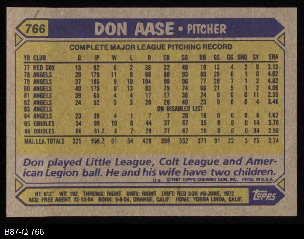 1987 Topps #766 Don Aase 8 - NM/MT