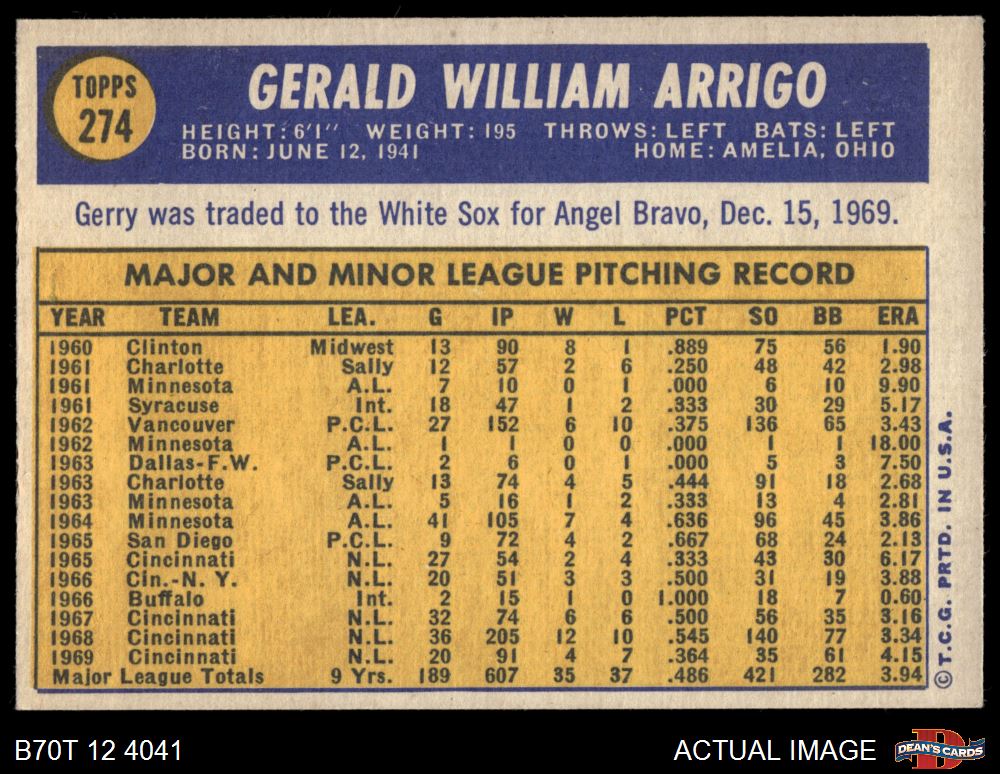 1970 Topps #274 Gerry Arrigo 6 - EX/MT