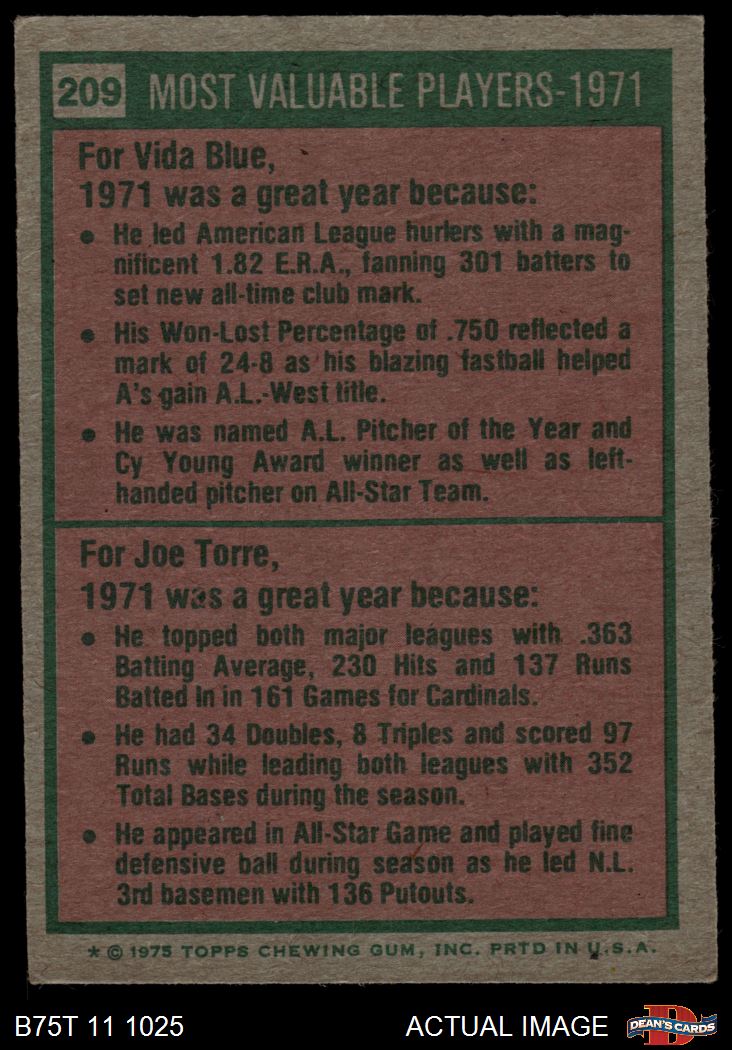 1975 Topps #209 - Vida Blue / Joe Torre 1971 MVPs 3.5 - VG+