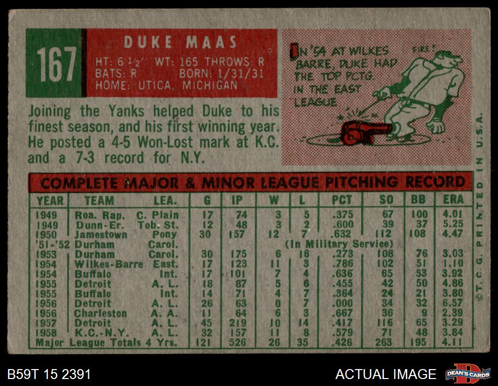 1959 Topps #167 Duke Maas 3.5 - VG+