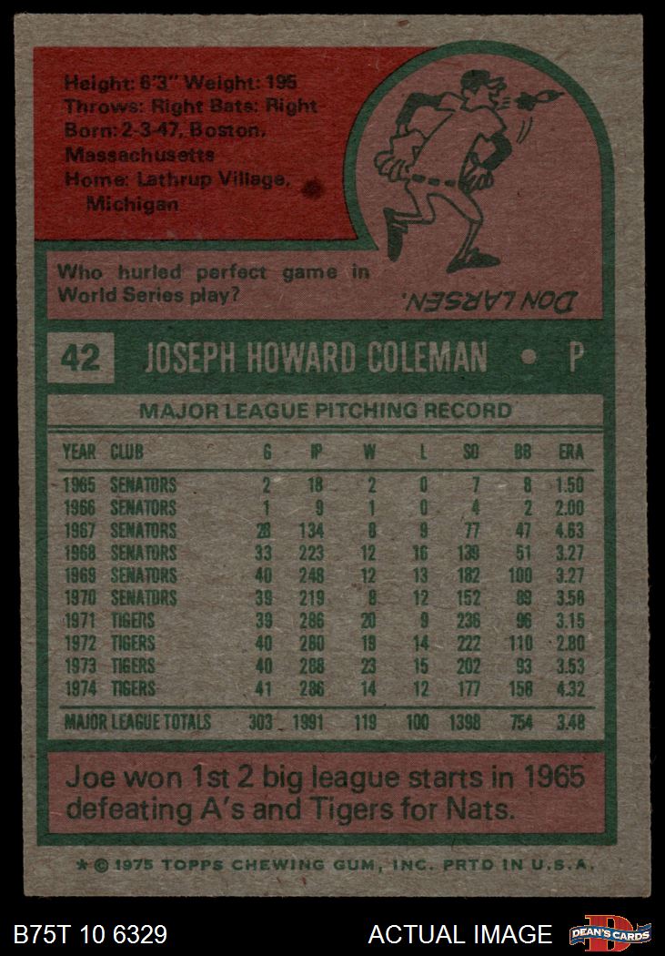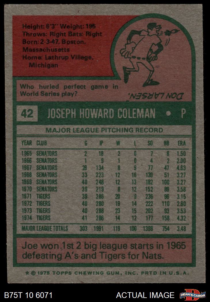 1975 Topps #42 Joe Coleman 6 - EX/MT