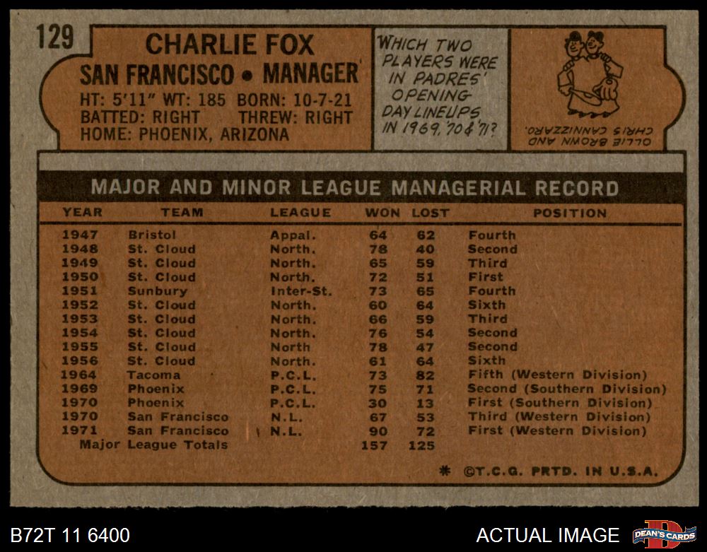 1972 Topps #129 Charlie Fox 3 - VG