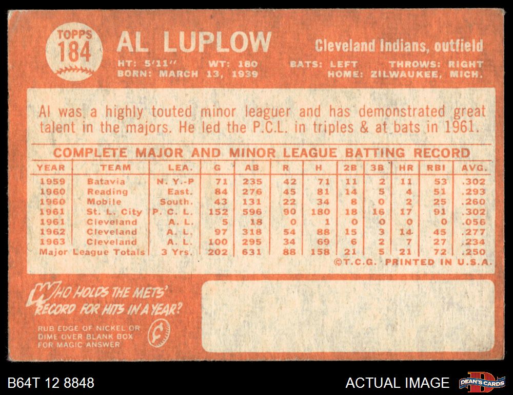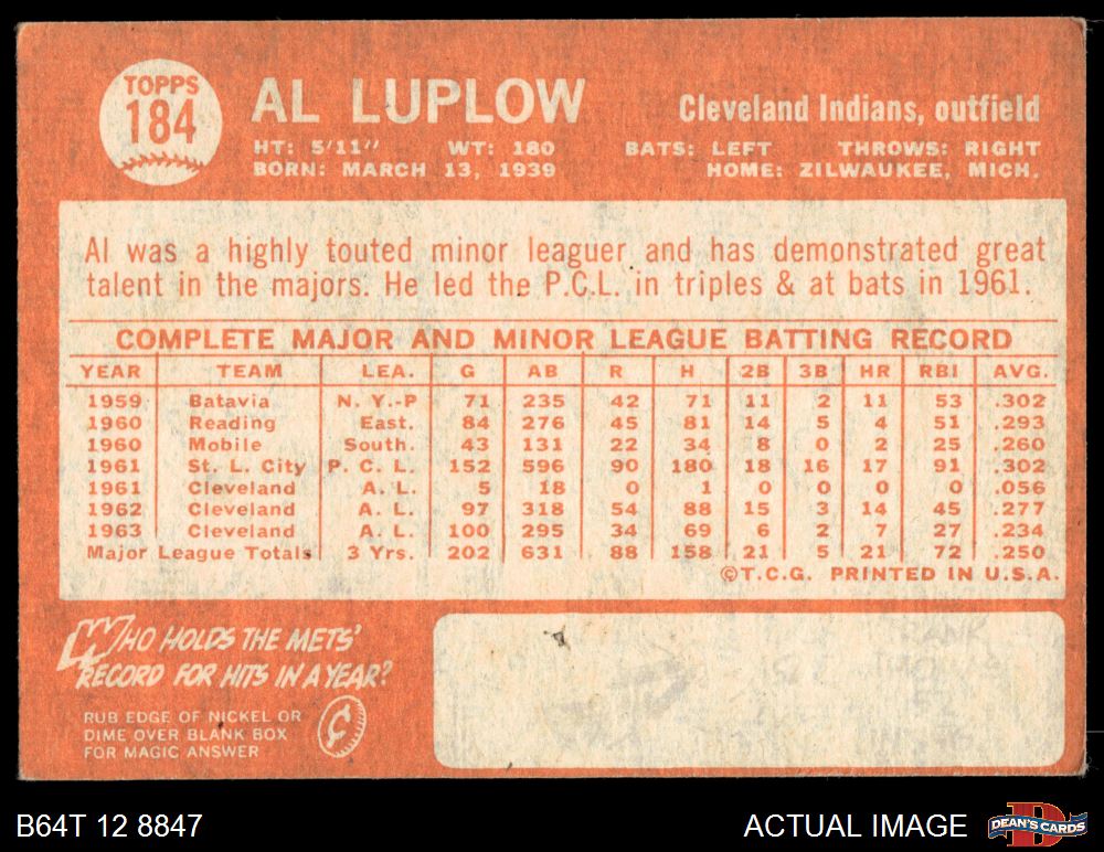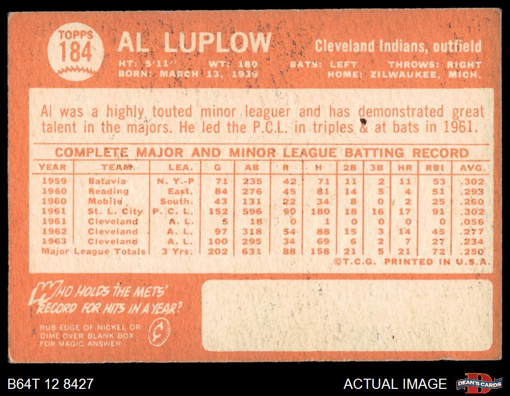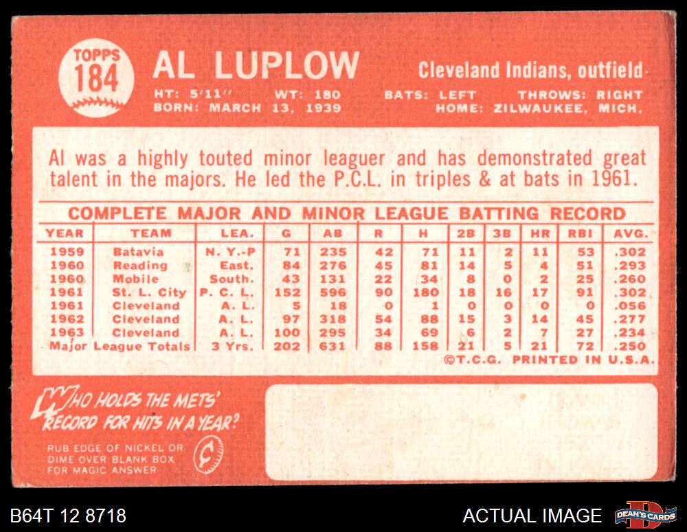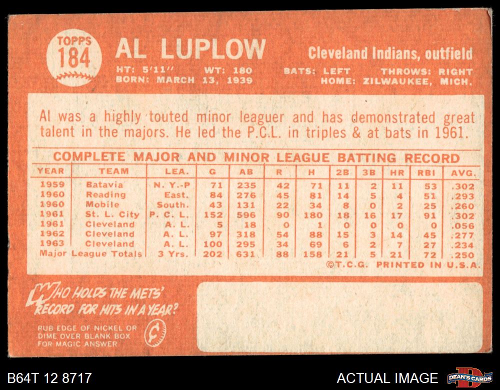 1964 Topps #184 Al Luplow 3 - VG