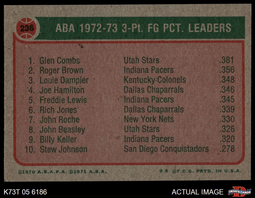 1973 Topps #236 - Glen Combs / Roger Brown / Louie Dampler ABA 3 Pt. Field Goal Pct. Leaders 4 - VG/EX