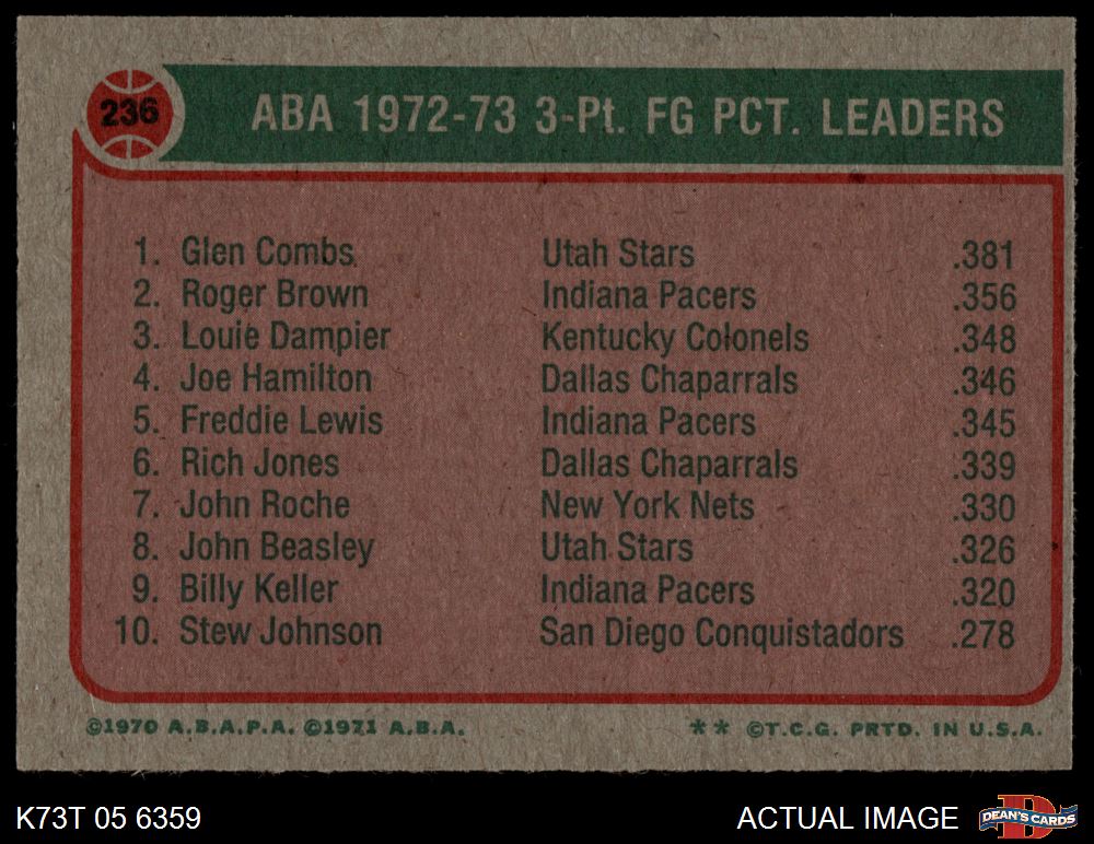 1973 Topps #236 - Glen Combs / Roger Brown / Louie Dampler ABA 3 Pt. Field Goal Pct. Leaders 5 - EX