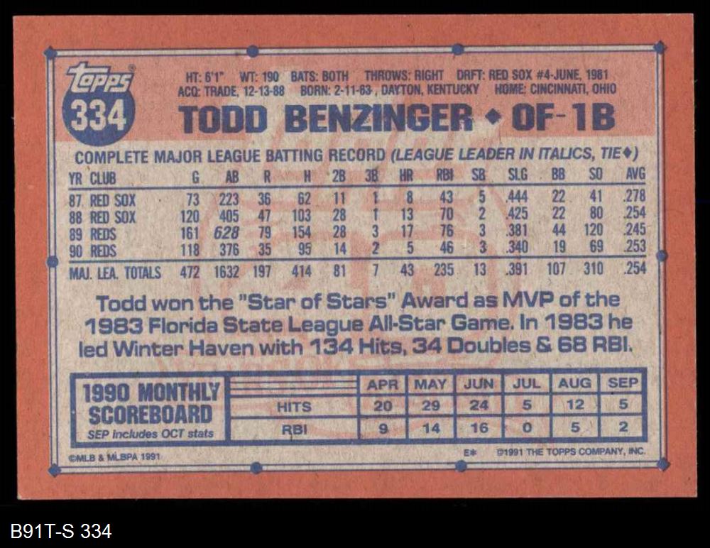 1991 Topps #334 Todd Benzinger 8 - NM/MT
