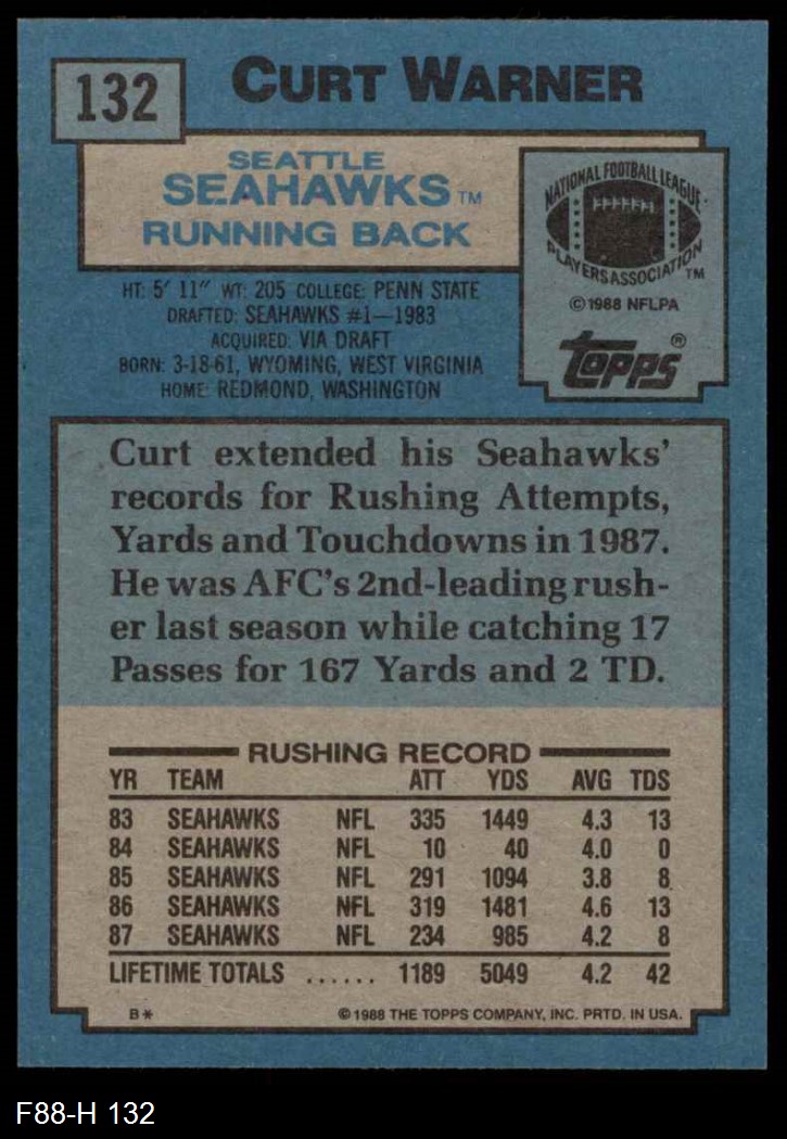1988 Topps #132 Curt Warner 8 - NM/MT