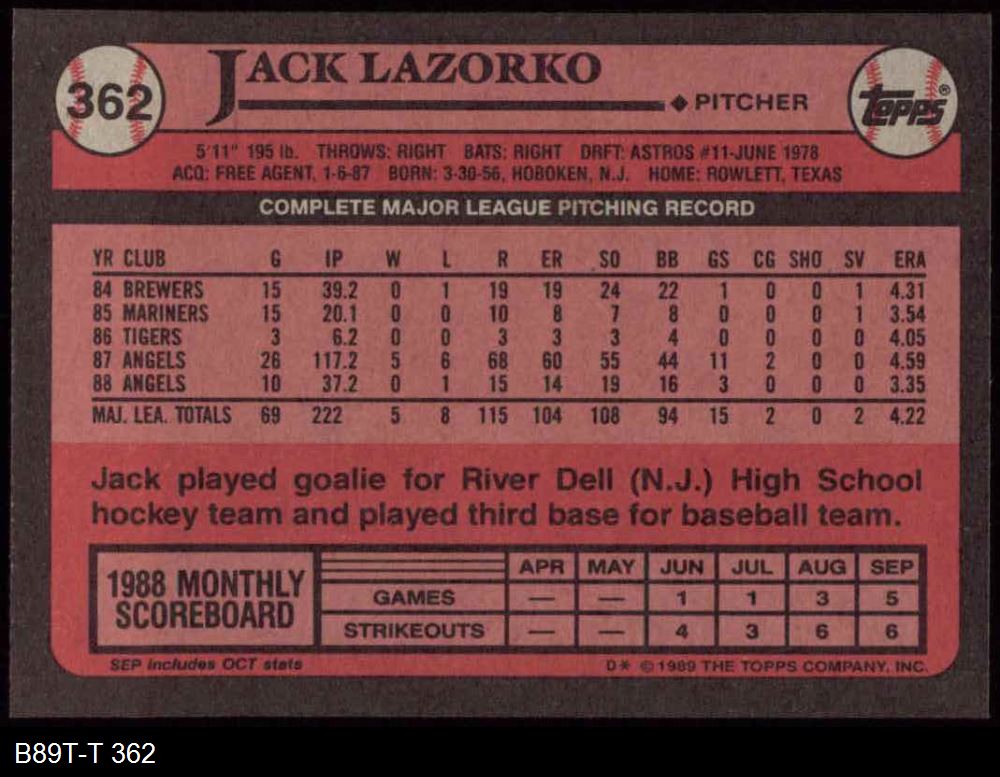 1989 Topps #362 Jack Lazorko 8 - NM/MT