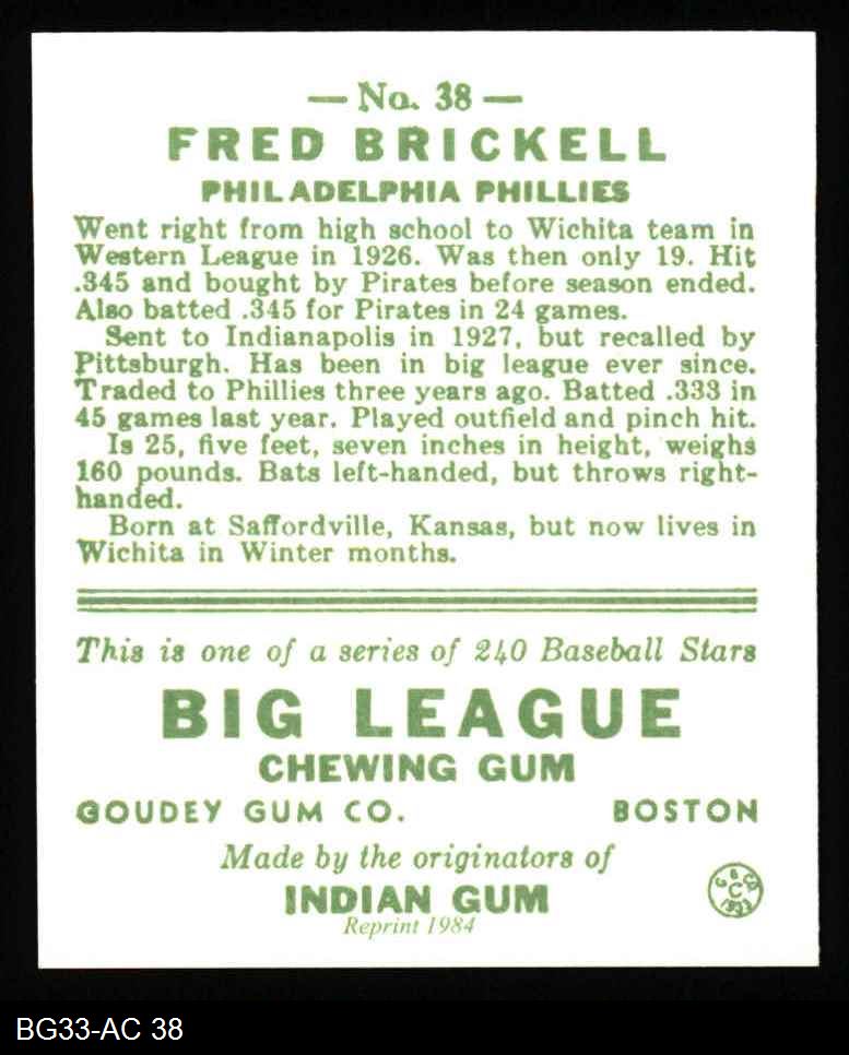 1933 Goudey Reprint #38 Fred Brickell 8 - NM/MT