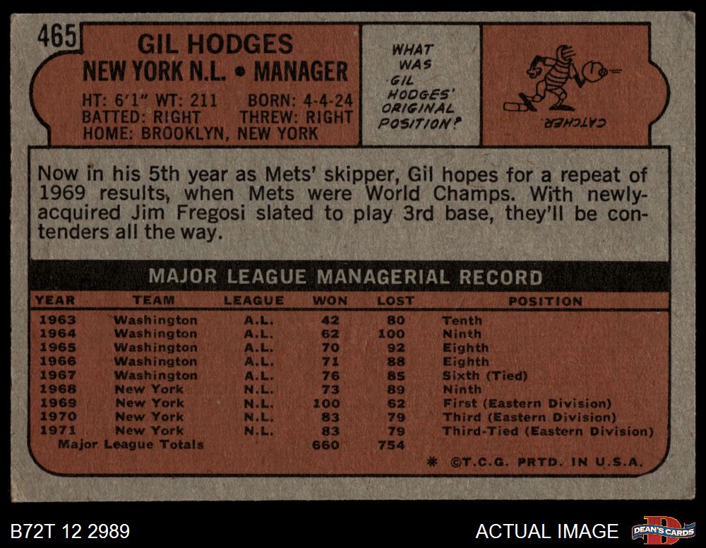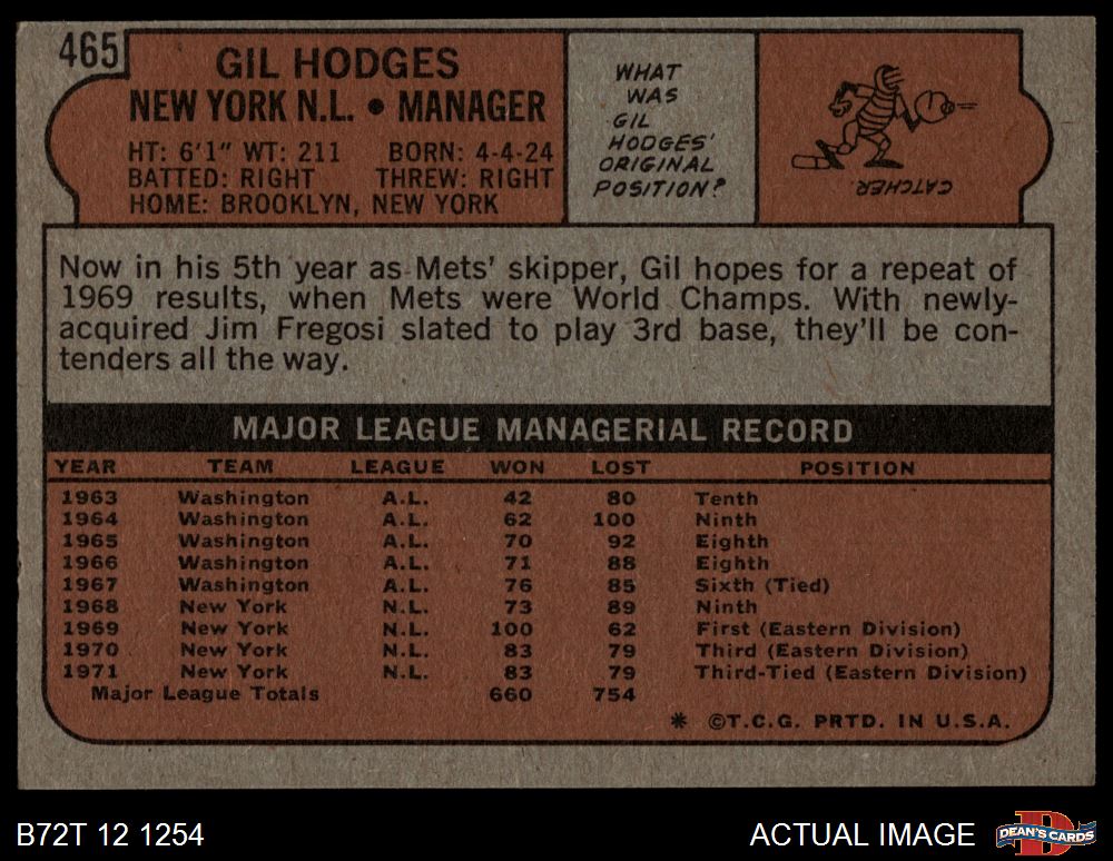 1972 Topps #465 Gil Hodges 3 - VG