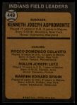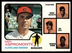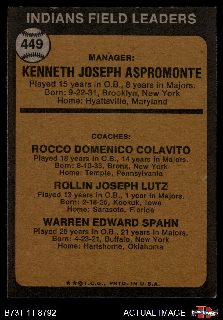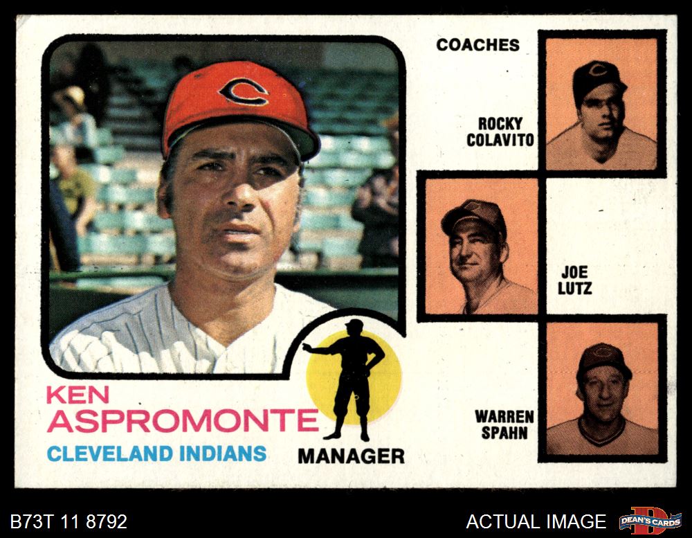 1973 Topps #449 RND - Ken Aspromonte / Rocky Colavito / Joe Lutz / Warren Spahn Indians Leaders 5 - EX