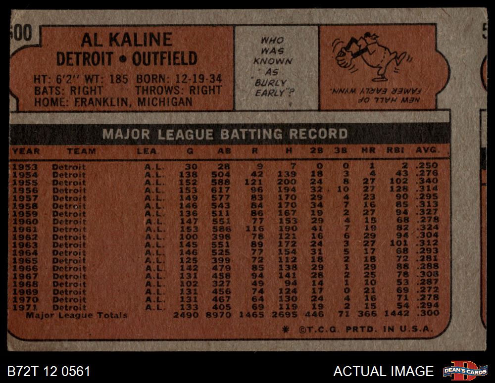 1972 Topps #600 Al Kaline AUTHENTIC