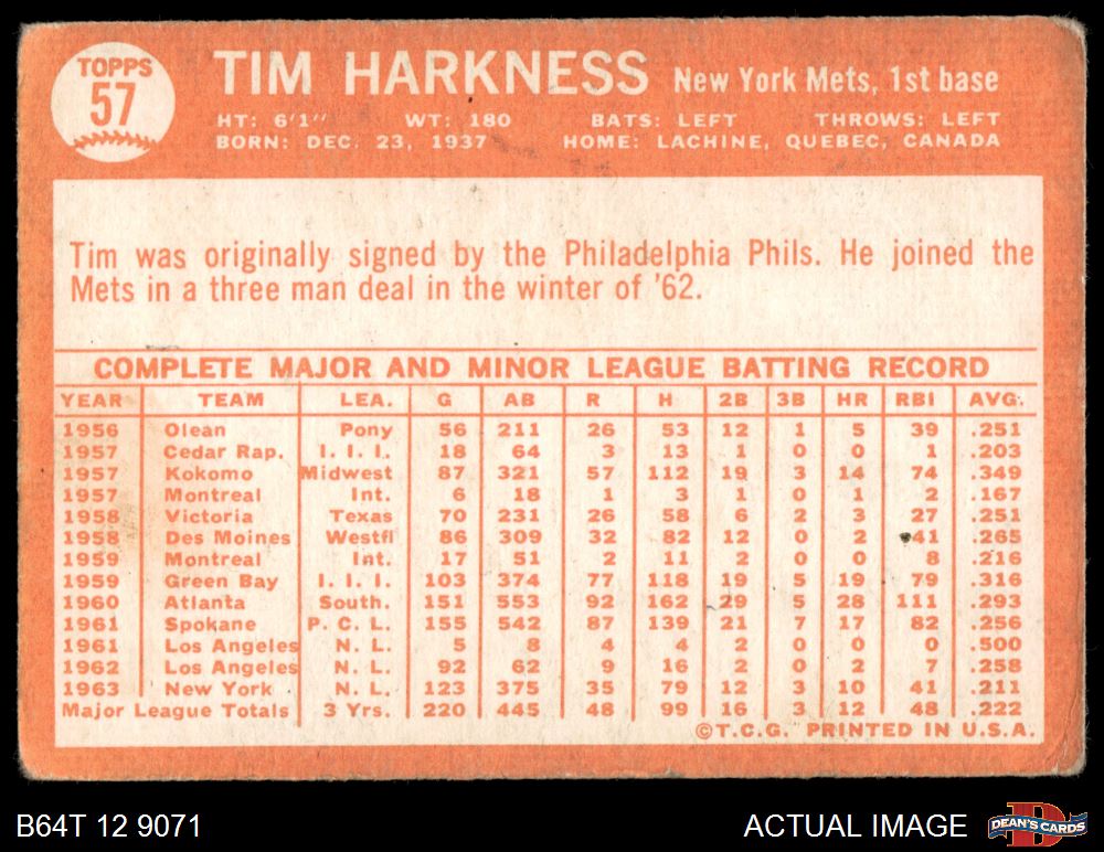 1964 Topps #57 Tim Harkness AUTHENTIC