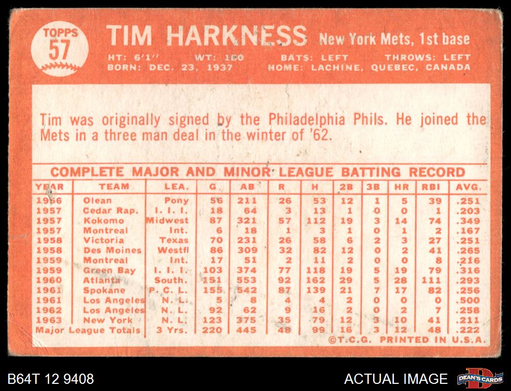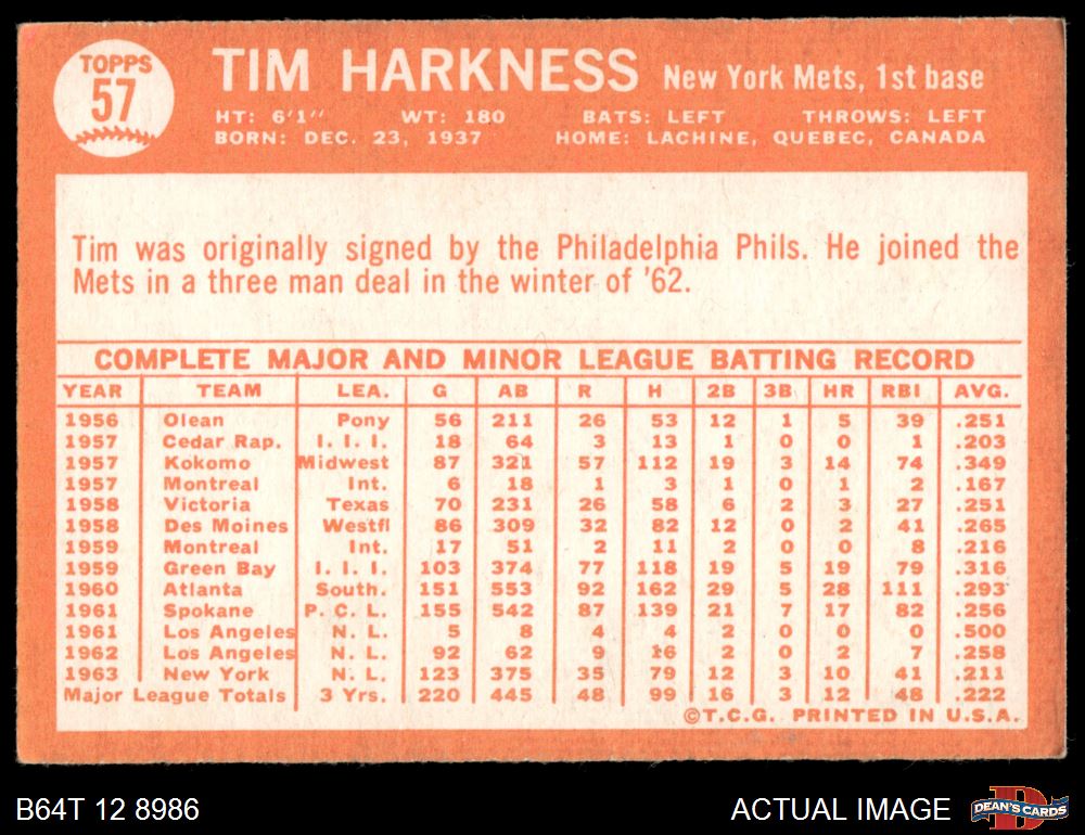 1964 Topps #57 Tim Harkness