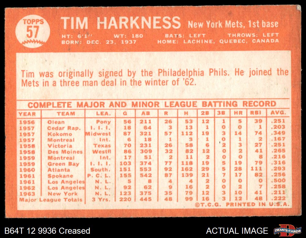 1964 Topps #57 Tim Harkness 2 - GOOD