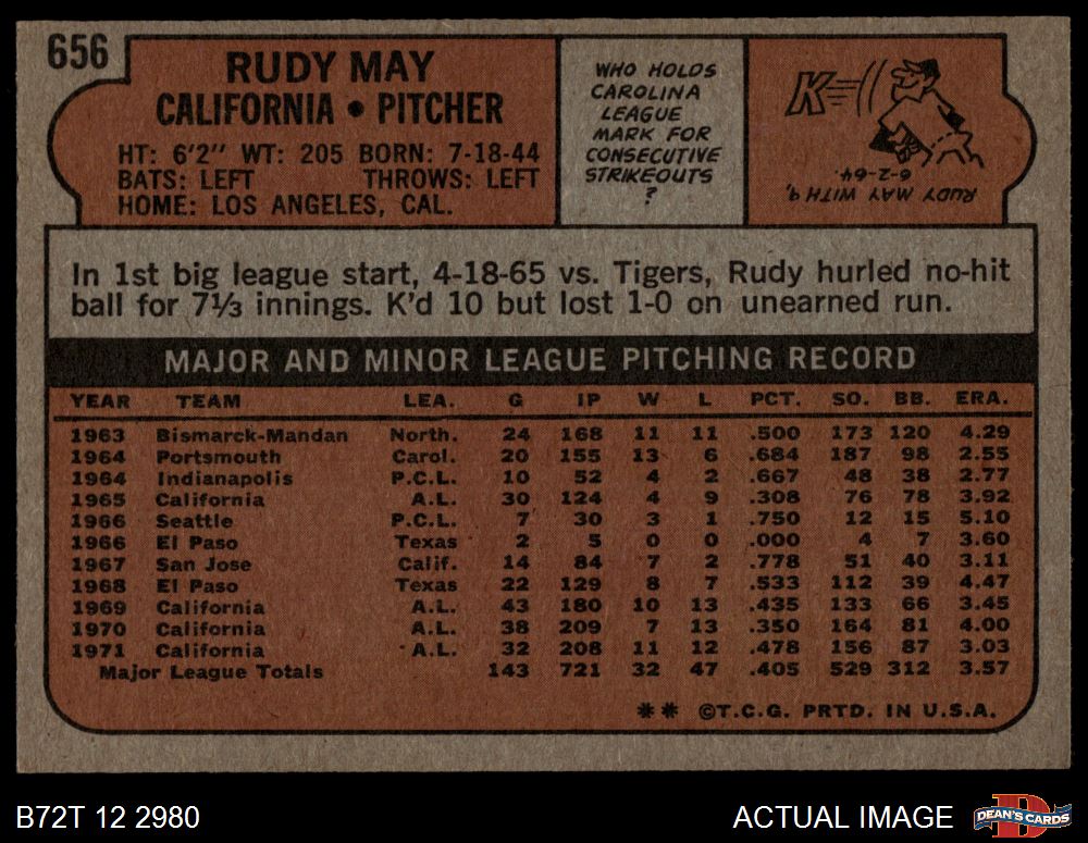 1972 Topps #656 Rudy May 3 - VG
