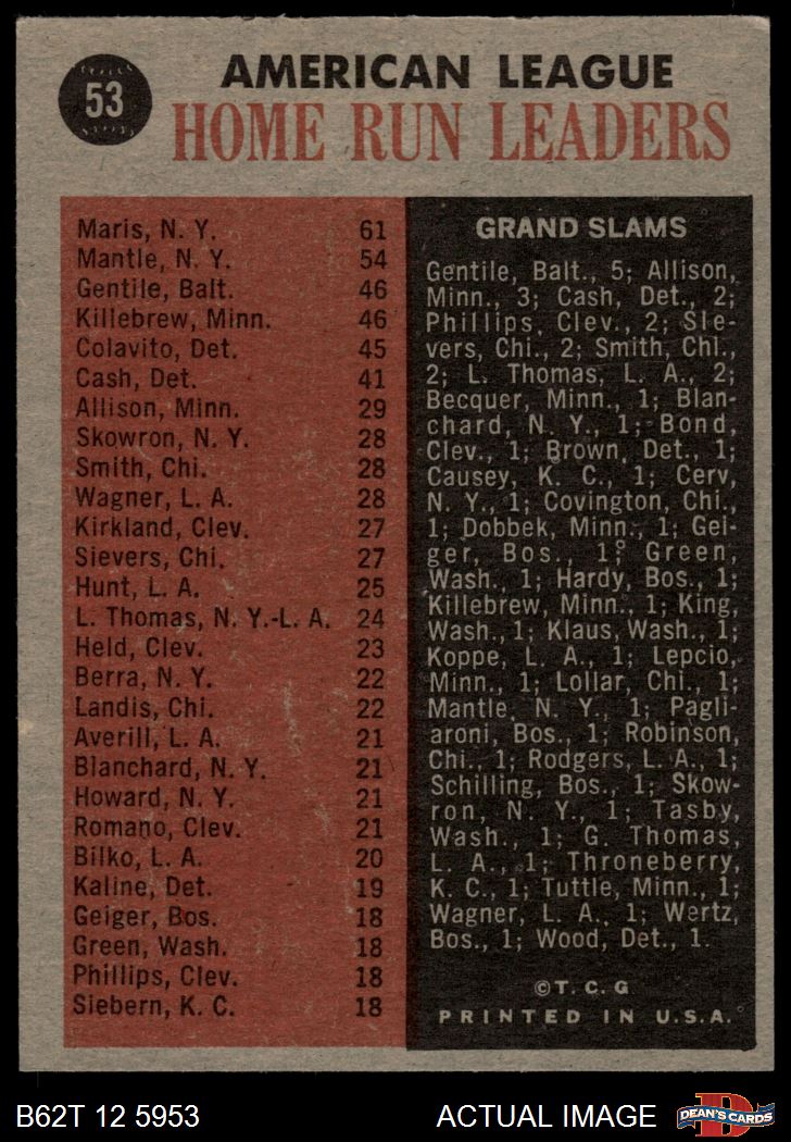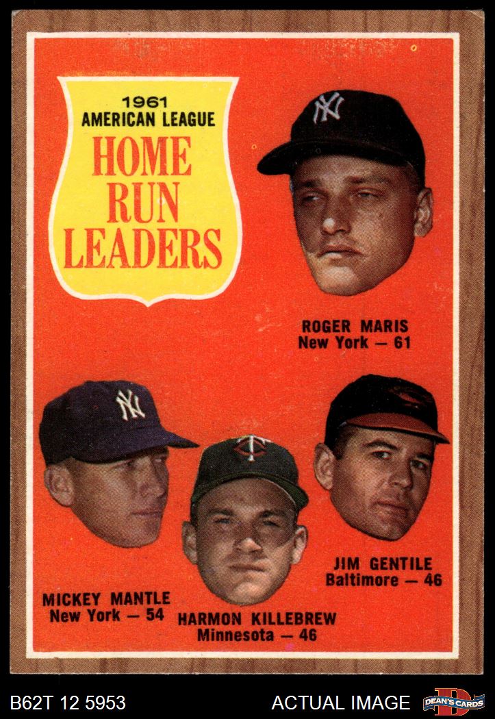 1962 Topps #53 - Mickey Mantle / Roger Maris / Harmon Killebrew / Jim Gentile AL HR Leaders 5 - EX