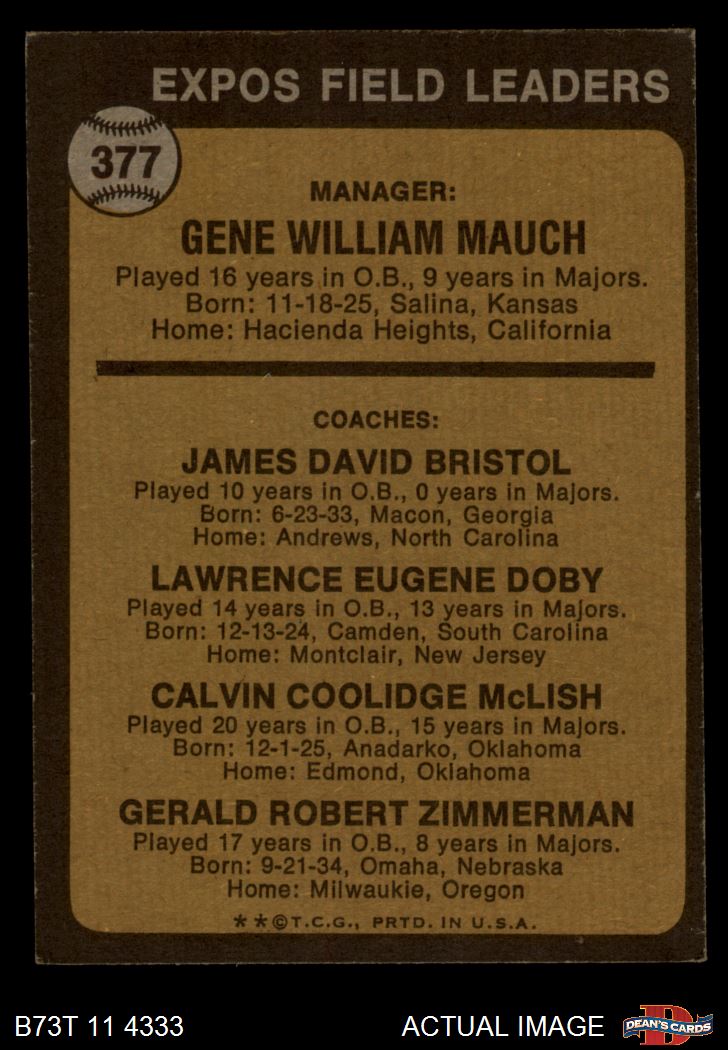 1973 Topps #377 - Gene Mauch / Dave Bristol / Larry Doby / Cal McLish / Jerry Zimmerman Expos Leaders 3 - VG